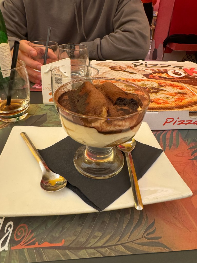 The pizza that looks like a square was the best one we tried. It’s a Quadrii (Square shaped pizza) We ordered the Fuoco e fiamme (Crust has ricotta, spicy salami and peperonata, the center has tomato sauce, mozzarella, spicy salami, ‘nduja, peperoneta, sausage and grana.) The picture in the right was a tiramisu.